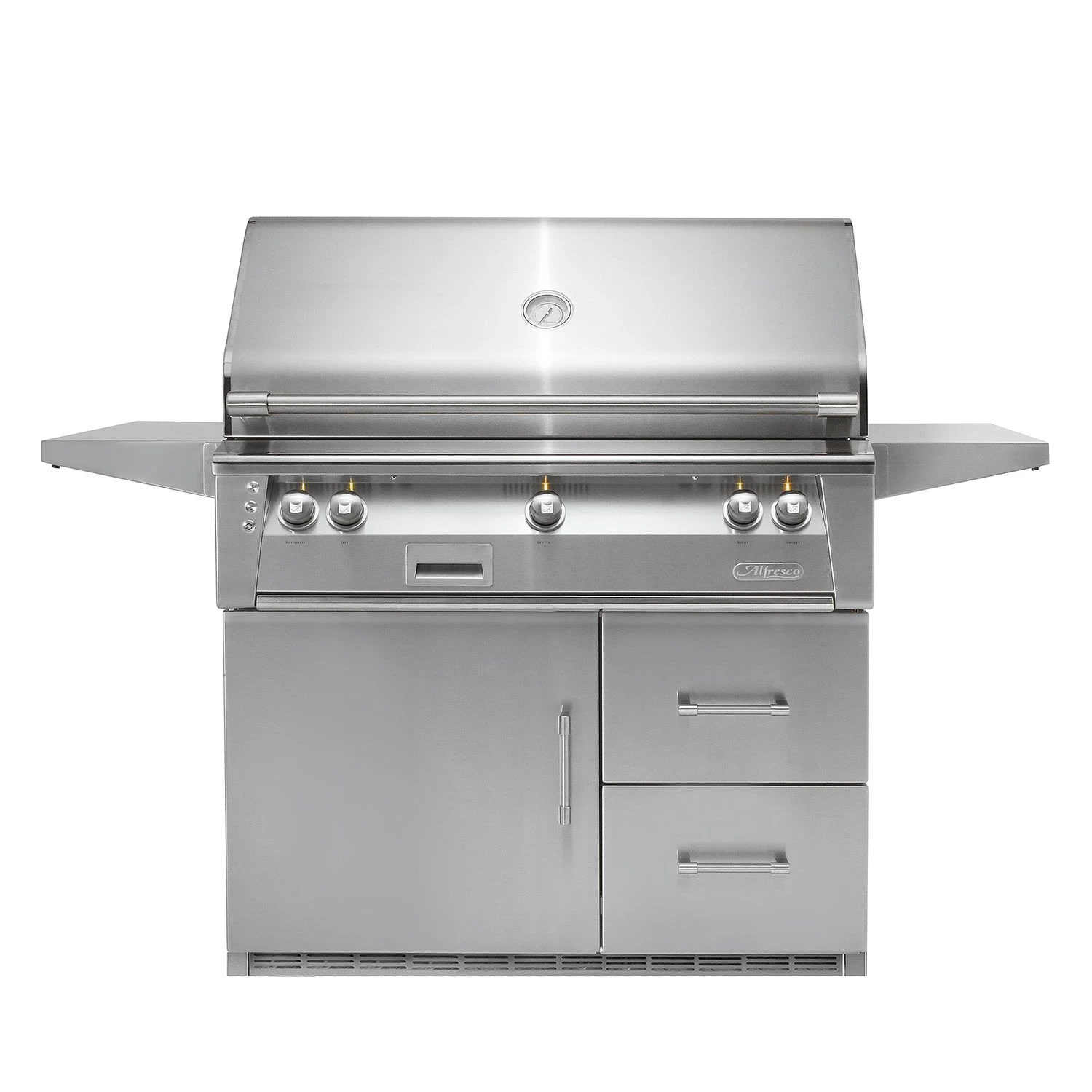 Alfresco ALXE-42RFG Refigerated Cart Grill, 42-Inch provides a high performance luxury grill that is a terrific option to complete your outdoor kitchen. The 304 stainless steel grill features (3) 18-SR stainless steel main burners producing 82,500 BTUs with 770 square inches of grilling area with the option to upgrade to a Sear Zone infrared burner or a dual side burner. The Sear Zone features a “V-shaped” design and reaches temperatures up to 1500°F to produce professional steakhouse results using up to 50% less fuel. Above the burners, the pyramid-shaped ceramic briquettes eliminate hot and cold spots to maximize flavor as they evenly deliver heat to the cooking surface. The premium cooking grates have a special nonstick electro-polished finish, to achieve professional grill marks every time. The industry first refrigerated cart includes 1 door and 2 drawers that are refrigerated to allow you to keep condiments, meats, vegetables and beverages within reach while grilling.