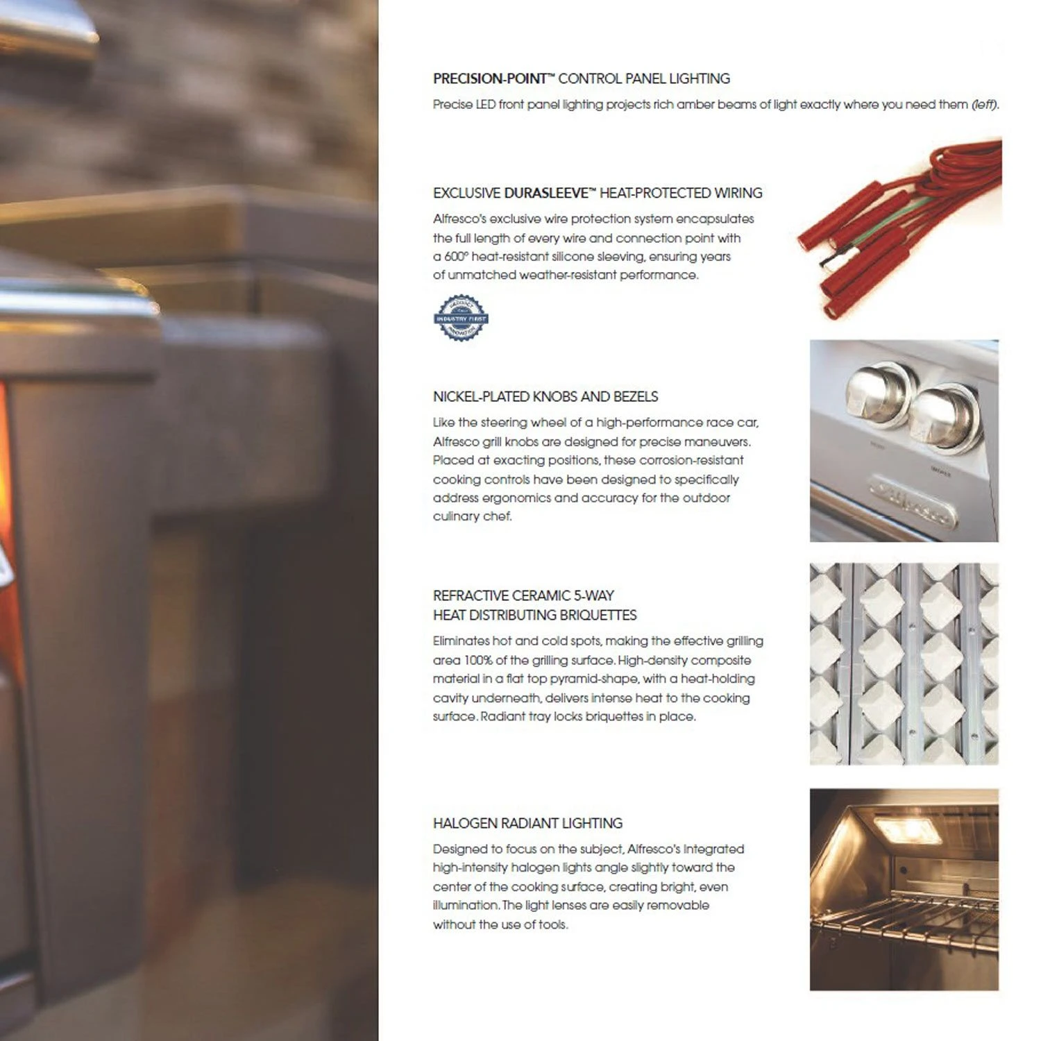 - Exclusive Safe Touch and Hood-Assist Alfresco’s signature air-cooling system keeps the front control panel and bullnose cool to the touch as well as protects all the electronics. The EZ-Lift hood design allows for easy hood lifting and closing while you cook.