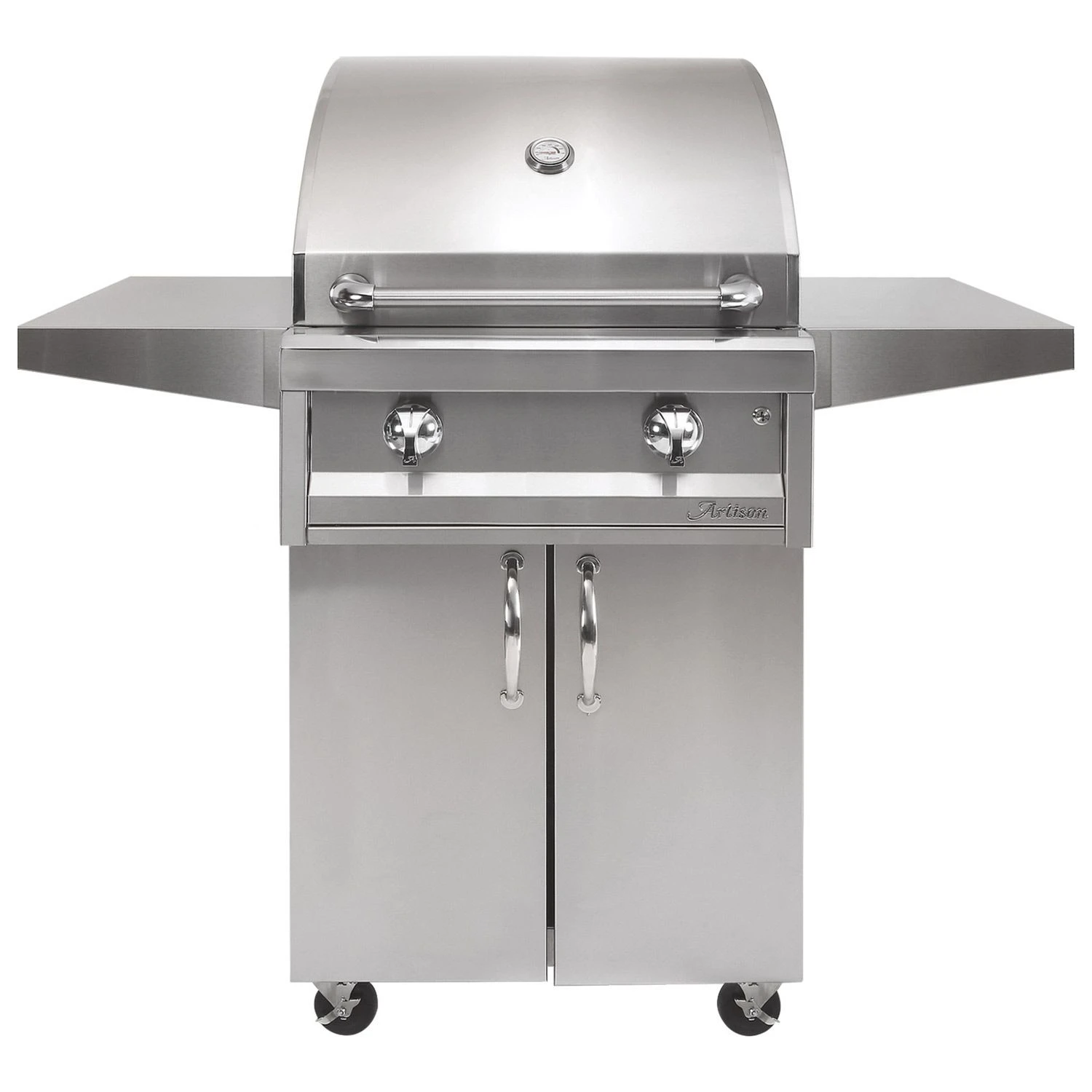 Artisan AAEP-26C American Eagle Series 26-Inch Gas Grill on Cart provides a luxury grill package at an affordable price. Featuring commercial-grade 304 stainless steel construction, Artisan’s Professional Grills are meticulously crafted in the U.S.A. and designed for long-term durability. Heavy-duty 304 stainless steel burners offer high heat, while refractive five-way heat distributing briquettes offer even and radiant heat across the cooking surface. Durable stainless steel cooking grates with a special non-stick electro-polished finish offer restaurant quality cooking and easy cleaning, while an integrated warming and grilling rack provides more versatile cooking options. Ergonomic grill knobs and brass valves offer precision flame control, while stainless steel ignition and lighting buttons are integrated into the control panel for easy operation. This grill also features an exclusive air-cooling plenum which blasts a curtain of cool air between the front control panel and the firebox to keep the front panel and bullnose cool to the touch.