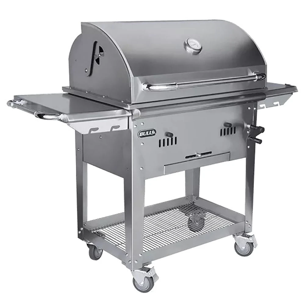 Bull BG-88000 30-Inch Bison Premium Freestanding Charcoal Grill offers a high performance freestanding charcoal grill alternative for your perfect outdoor kitchen. The 30-inch Bison grill is housed inside premium 304, 18 gauge stainless steel to ensure durability and longevity while the updated vent and gasket system offers greater temperature control and efficient oxygen flow throughout the firebox. The thick stainless steel grates offer high surface area to create the professional style sear marks everyone desires while the adjustable charcoal bed adds to the versatility of a unit that specializes in both low and slow BBQ grilling and high heat searing. The dual lined grill hood guarantees a flavor lock and great heat retention during cooking while keeping grillers safe from the charcoal’s smoke. The Bison grill cart includes 2 stainless steel side shelves to offer areas for food prep while the 4 heavy-duty casters make it much easier to move your grill from one place to another. Do yourself a favor and reward yourself this grilling season with a superior charcoal grill station from Bull BBQ.