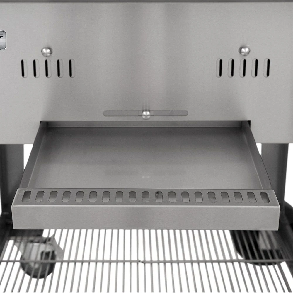 - Grill Cart Included – Grill cart with dual stainless steel side shelves and 4 heavy-duty casters for easy maneuverability