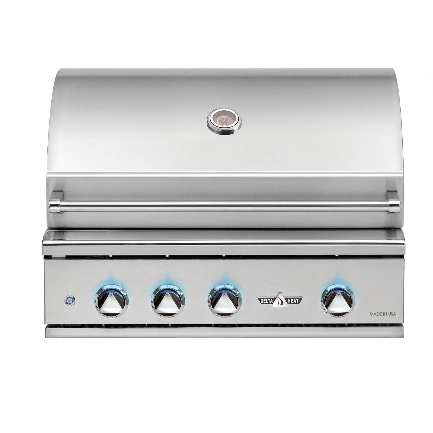 Delta Heat DHBQ32-D Built-In Gas Grill, 32-Inches provides an economically sized grilling surface along with high-end performance. Featuring three 18-Gauge stainless steel burners and a 525-square-inch grilling space, this grill has been built to exceed expectations. With optional add-ons, such as the Infrared Sear Zone and Infrared Rotisserie, this grill epitomizes what it means to be a high performance BBQ grill to fulfill the needs of any grill enthusiast. Additionally, new light switches and harnesses, an improved temperature gauge, and a heavier gauge rotisserie motor mount make the latest iteration of this grill even better than before.