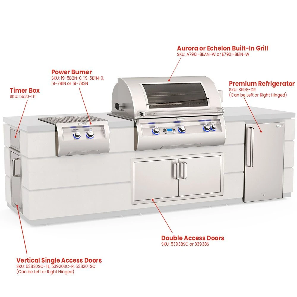 Fire Magic 115-Inch Outdoor Kitchen Island with 36-Inch Echelon Gas Grill, Power Burner, Refrigerator and Doors provides a complete linear outdoor kitchen island with high-quality construction and premium components. This contemporary outdoor grill island comes with a 36-inch Echelon gas grill head, power burner, refrigerator, double access doors and a choice of either a side access door or pull-out trash drawer. The island is constructed from durable Glass Fiber Reinforced Concrete and is easily assembled on-site. The reinforced concrete derives its strength from a high dosage of alkali-resistant glass fiber and acrylic polymer that is flexible without cracking. This island system is designed specifically for its Fire Magic equipment and makes a stunning outdoor kitchen. Make your space one of a kind and complete your outdoor kitchen dreams with the help of Fire Magic.
