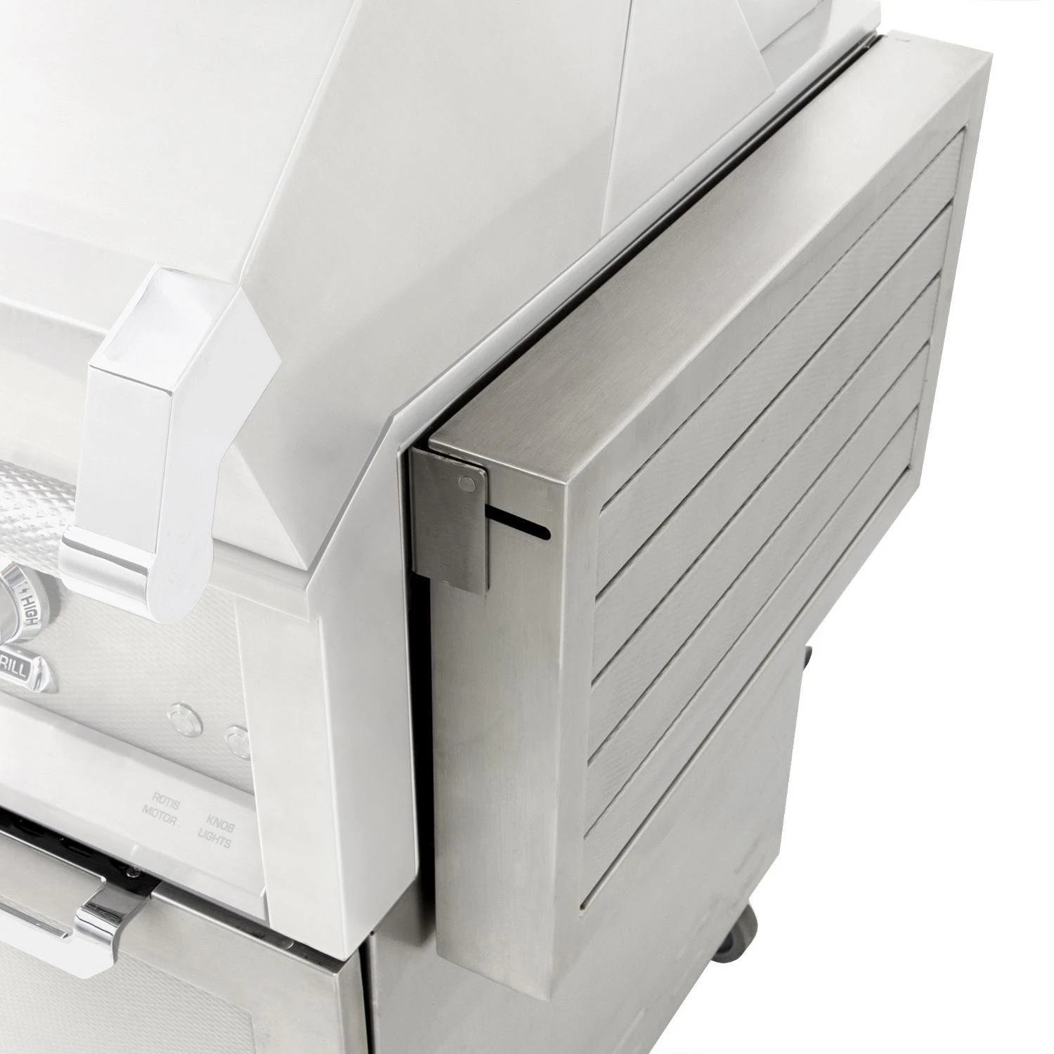 - Includes – Fold down shelves for increased space, slide out LP tank tray or trash storage, Marquise accented stainless steel panels