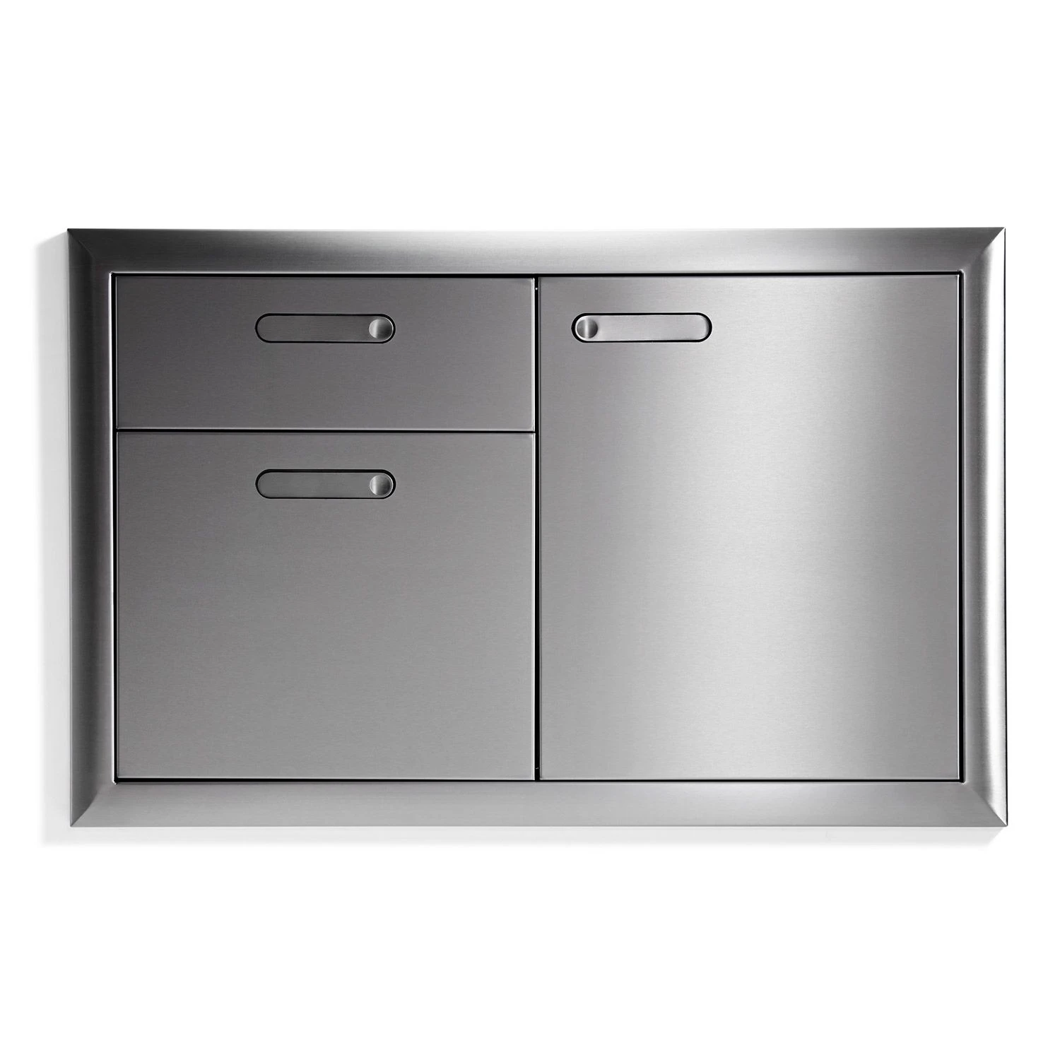 Lynx LSA36-4 Ventana Access Door And Double Drawer Combo, 36×23-Inch provides a high quality outdoor kitchen component to complete your ultimate outdoor BBQ paradise. This unit features a heavy 16-gauge 304 stainless steel construction with smooth welded joints for a blend of style and durability that will stand up to the elements in any climate. The single access door and double drawer combination provides a versatile range of storage options; the drawers are fully enclosed and feature full extension glides to allow easy viewing and retrieval of contents while the access door is perfect for a garbage can, LP tank, or larger grilling accessories and includes a removable condiment tray. The built in cabinet features integrated lighting to make finding and retrieving items easy while the locking door keeps contents secured inside. The Ventana style flush mount door handle and heavy duty latch provide a secure closure to keep the contents safely within. The entire line of Lynx Professional outdoor kitchen equipment features the same polished stainless construction for a matching stylized look to transport your kitchen outdoors.