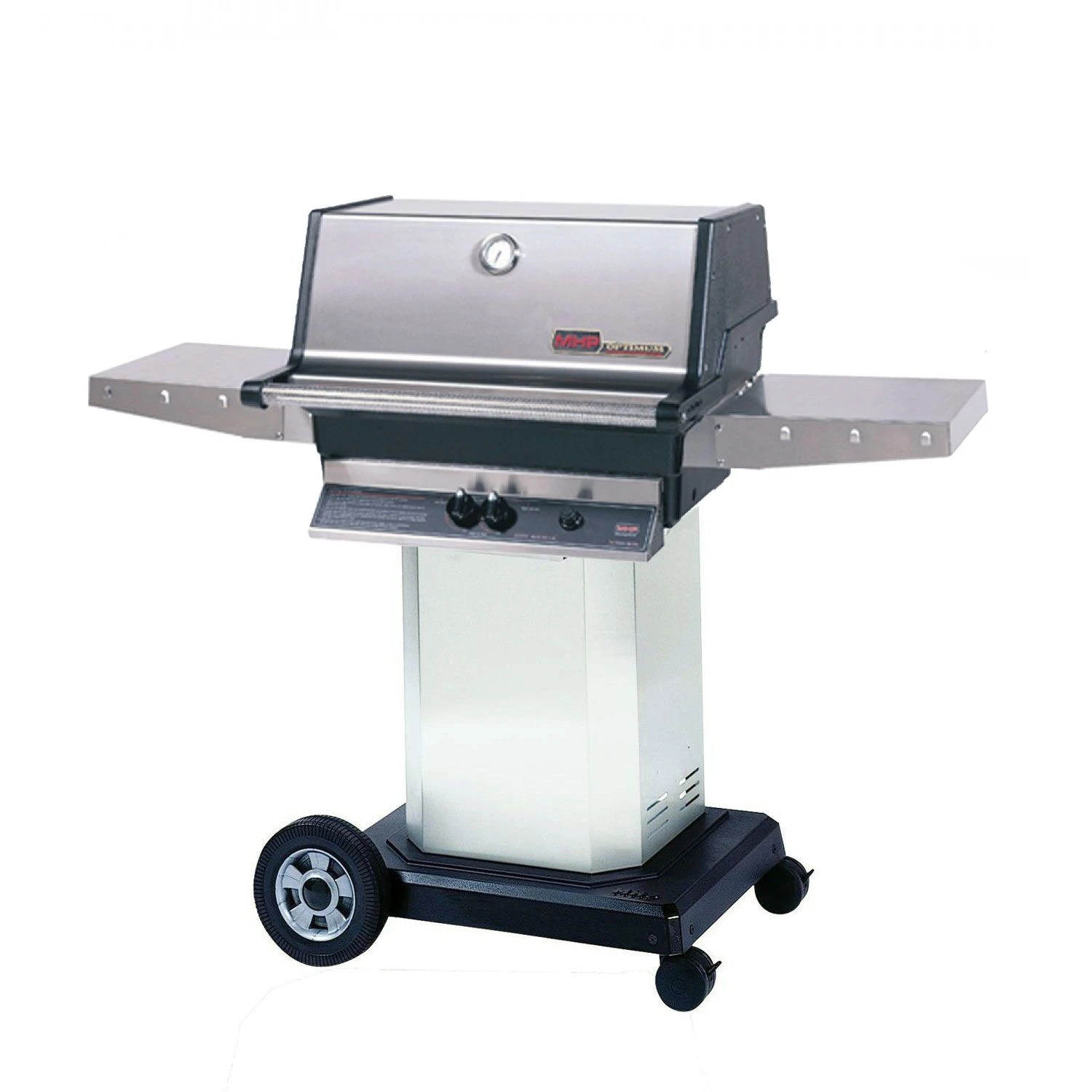 Modern Home Products TJK2 Gas Grill On Cart, 27-Inch offers a premium standing gas grill option that combines hand-crafted, high quality materials with superior function and timeless tradition. The grill features stainless steel construction to provide an elegant, durable hood that promotes heat retention while the rolling Sta-Kool stainless steel hood handle makes opening your grill a breeze. This unit includes 5/16-inch thick stainless steel grids and a secondary stainless steel warming rack or can be upgraded to include two aluminum rust-free SearMagic grids and a SearMagic warming rack. The reversible SearMagic technology is characterized by one wide-ribbed side for achieving professional sear lines and one smooth side for foods such as fish or vegetables. The H-shaped dual burner along with the FlavorMaster porcelain briquettes work together to create 40,000 BTU of power and provide precise heat control for the perfect BBQ flavor. The on-cart grilling option offers the 27-inch gas grill head on a freestanding aluminum cart with two wheels. You also have the option to pair your grill with a 4-wheeled (2 casters) black aluminum or stainless steel column. All of this, in addition to the 433 square inches of main cooking area, two added stainless steel side shelves and built-in temperature gauge, makes for a grill that is just as functional as it is luxurious. Upgrade your grill with a SearMagic Infrared Zone Side Burner, Stainless Steel Side Burner or Infra-Roast Rear Rotisserie Burner.