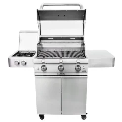 Napoleon RXT425SIBK Rogue XT 425 Black Gas Grill on Cart with Infrared Side Burner, 23.75-Inches offers an impressive grilling package in an attractive design. Featuring durable stainless steel construction, the Napoleon Rogue XT will be a mainstay at your backyard barbecues for many years to come. Featuring three main burners and a high top lid, this grill offers dynamic cooking potential as well as a convenient design. An integrated sear station helps create restaurant-style results, while generous side shelf space ensures you’ll always have plenty of room to add finishing touches when prepping your meals. This grill also features an attractive black design to set it apart from the crowd.