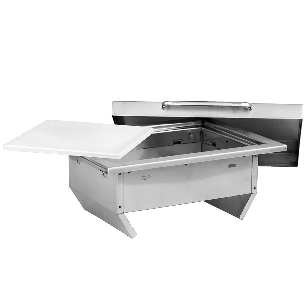 Saber K00AA6518 Stainless Steel Trash Chute, 14×16.5-Inches provides a premium component for your outdoor kitchen setup. Featuring premium 304 stainless steel construction, this unit has been built to the same high standards as the rest of Saber’s outdoor products. This trash chute provides countertop access to a trash bin (not included) for easy waste disposal to keep your outdoor kitchen surfaces clear. An included lid with a side-mounted handle allows for flat surface work, while the included 9.75 x 9.75-inch high-density polyethylene cutting board offers added convenience.