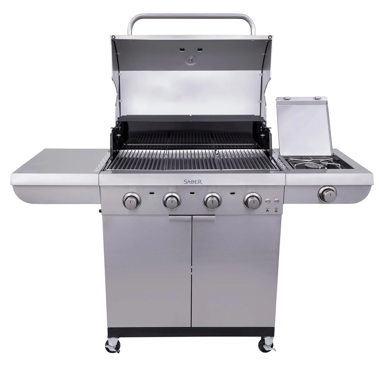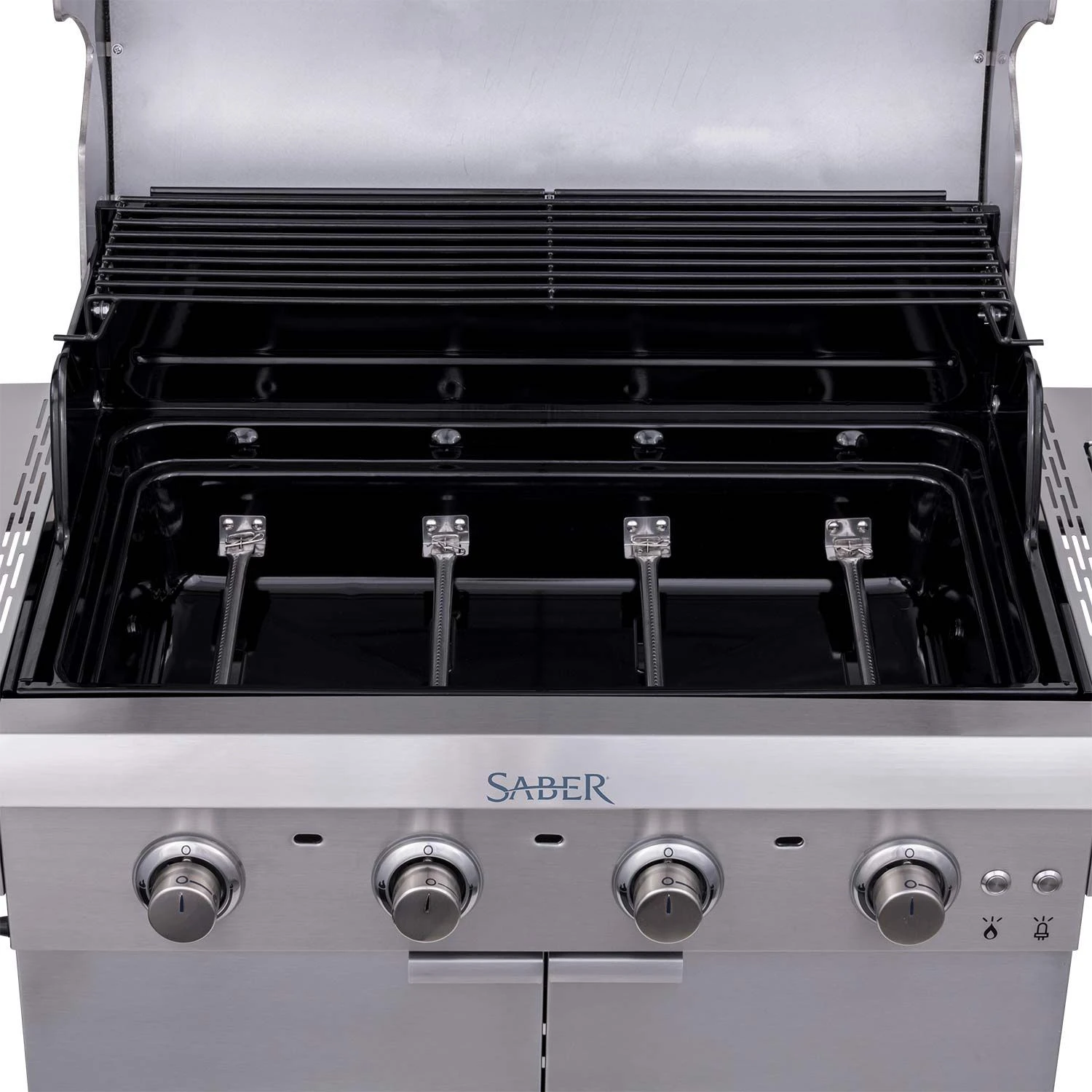 Saber R52SC0421 4-Burner Select Freestanding Infrared Grill with Side Burner, 40-Inches provides a premium addition to your outdoor kitchen. This grill brings restaurant quality results to your home with its patented Saber Cooking System. This innovative burner design heats evenly, eliminates flare-ups, and uses up to 30 percent less gas than comparable burners. This grill also offers a wider temperature range than traditional grills–from high temperature searing to low and slow roasting and everything in between. The Saber infrared can also pre-heat to searing temperatures in only 12 minutes to reduce the time it takes to get your food from grill to plate. When you’re finished grilling, the easy-to-clean design of the Saber grill allows food drippings to be burned off and brushed away with ease to save you even more time.