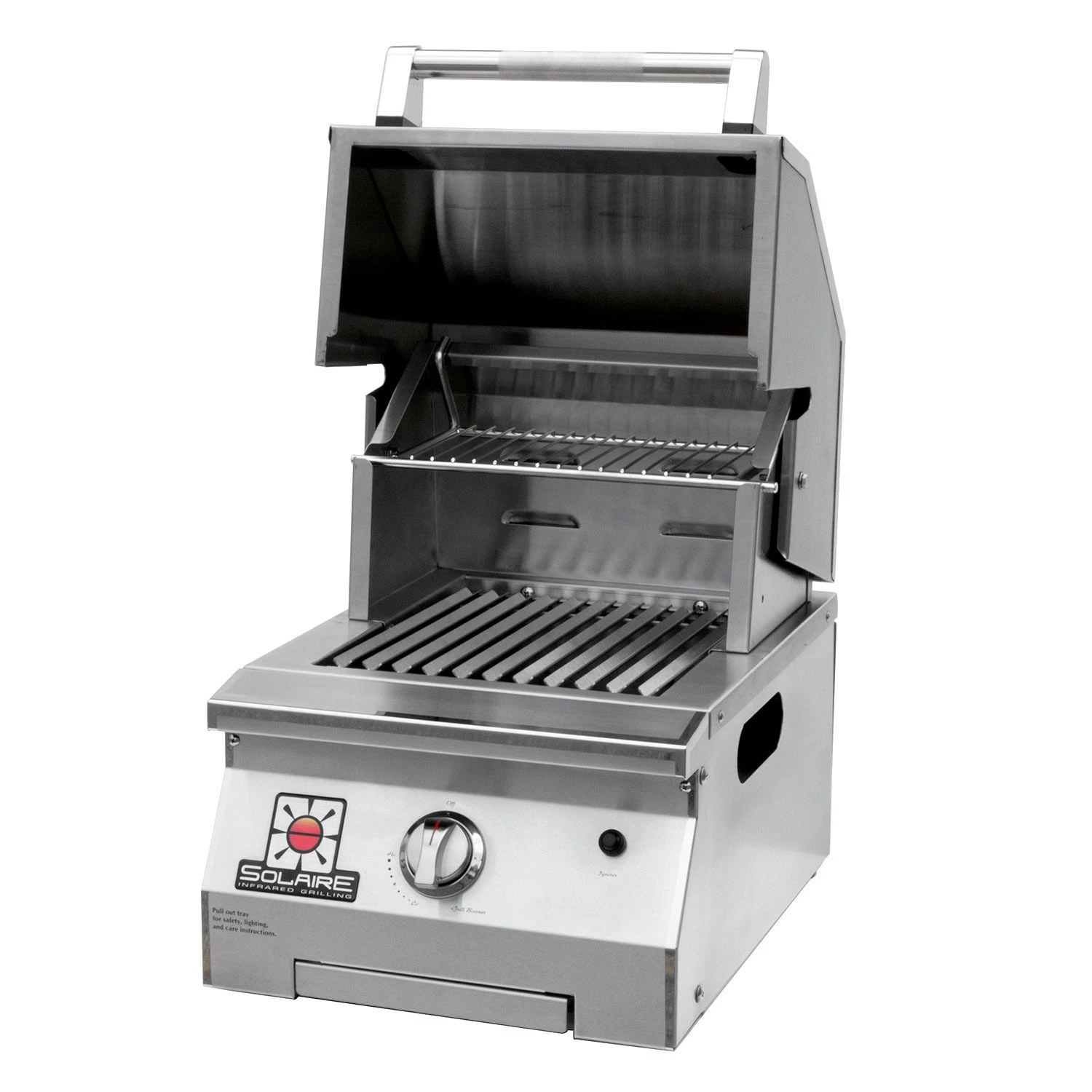 Solaire SOL-IRBQ-15GIR-LP Accent Single Burner Infrared Portable Grill with Warming Rack, Propane provides a professional quality infrared grill designed to offer an improved backyard grilling experience. This single burner grill offers a full grilling experience in a small package. Featuring heavy duty stainless steel construction, this portable grill features the same quality design as larger models to ensure superior durability. A 12,000 BTU burner offers impressive heat across 216 square inches of grilling area–great for those with limited space but who still want a high performance grill. This grill also offers impressive added features such as a double-skin oven hood, stay-cool handle, and a top-supporting, self-trimming design for easy built-in installation.