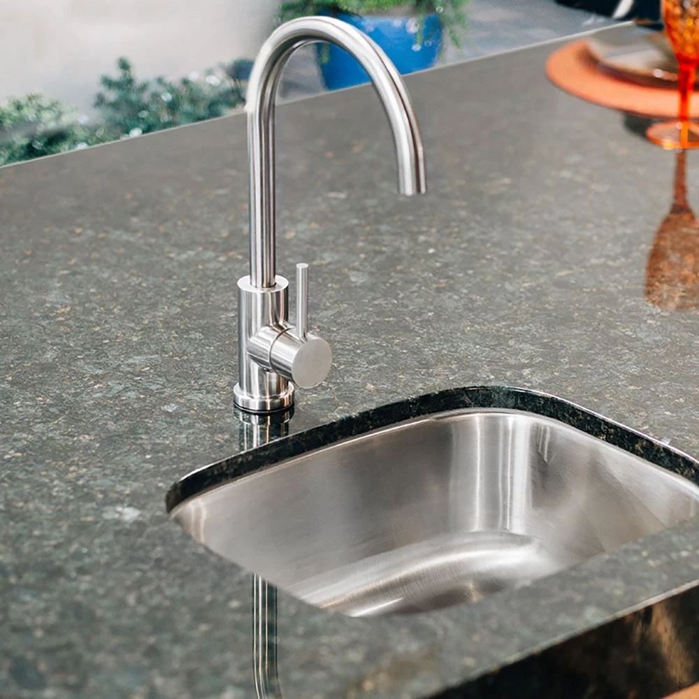 Summerset SSNK-19U Under Mount Sink and Faucet provides a premium sink and faucet option for your outdoor kitchen. Bring the convenience of your indoor kitchen to your backyard with this 304 stainless steel unit built with durability in mind. With its gooseneck faucet and under mount design, this sink offers a simple contemporary look to match nearly any decor–it also accommodates larger pots, pans, and dishes with ease. A single handle allows full control of both hot and cold water for simplicity and ease of use. As an added bonus, this sink includes a stopper plug for use as needed. Upgrade your outdoor kitchen with help from Summerset.