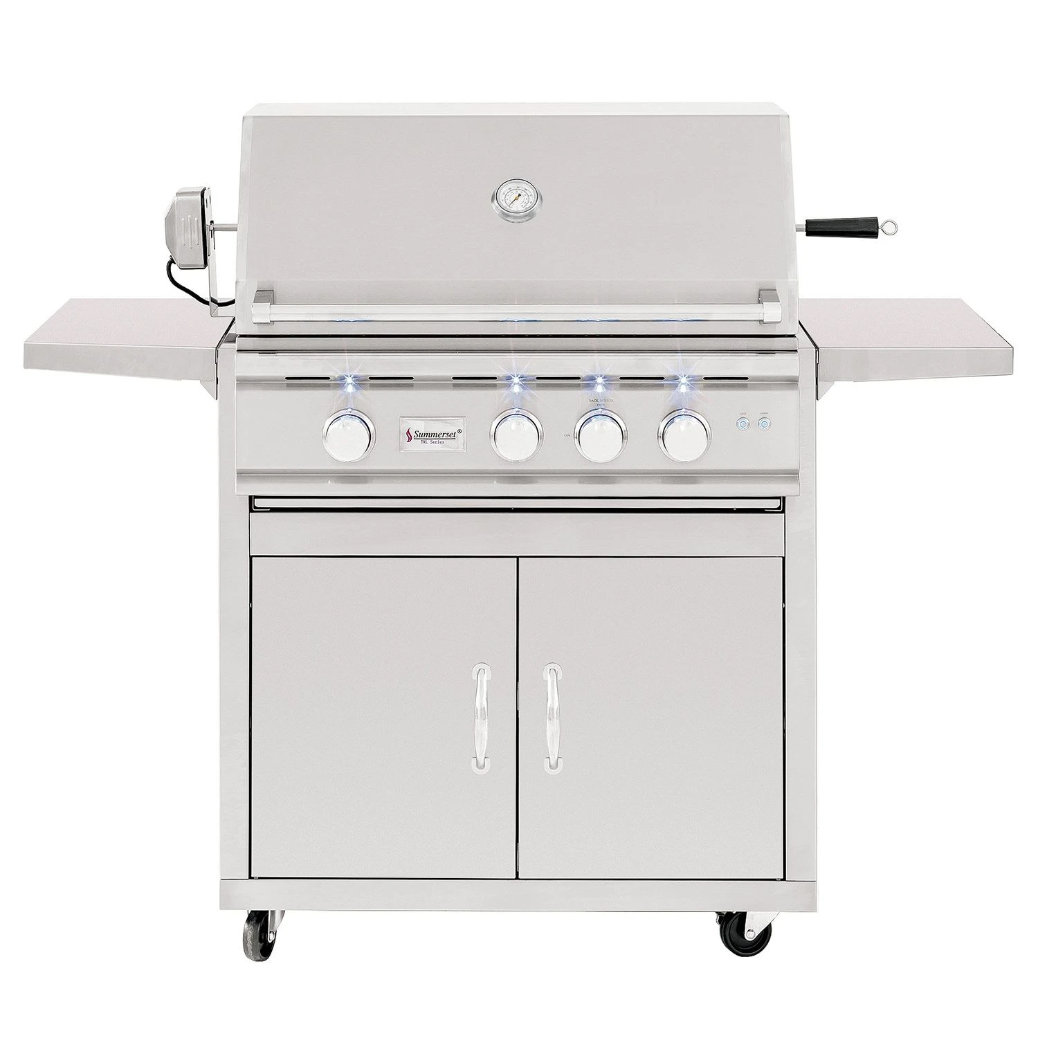 The 32-inch TRL also features a unique Flame Thrower Ignition that shoots a burst of flame to ignite the main burners and is much more reliable than traditional spark ignition systems. The insulated and double lined hood keeps hot air in to ensure a consistent grilling environment complete with a built in 3-inch temperature gauge and interior halogen lighting with LED front panel lighting. In addition, the 15,000 BTU infrared back burner offers a high quality rotisserie burner for professional style rotisserie cooking. The stainless steel grill cart features double door storage, fixed shelves, and high quality locking casters to provide a terrific stand alone grill option.