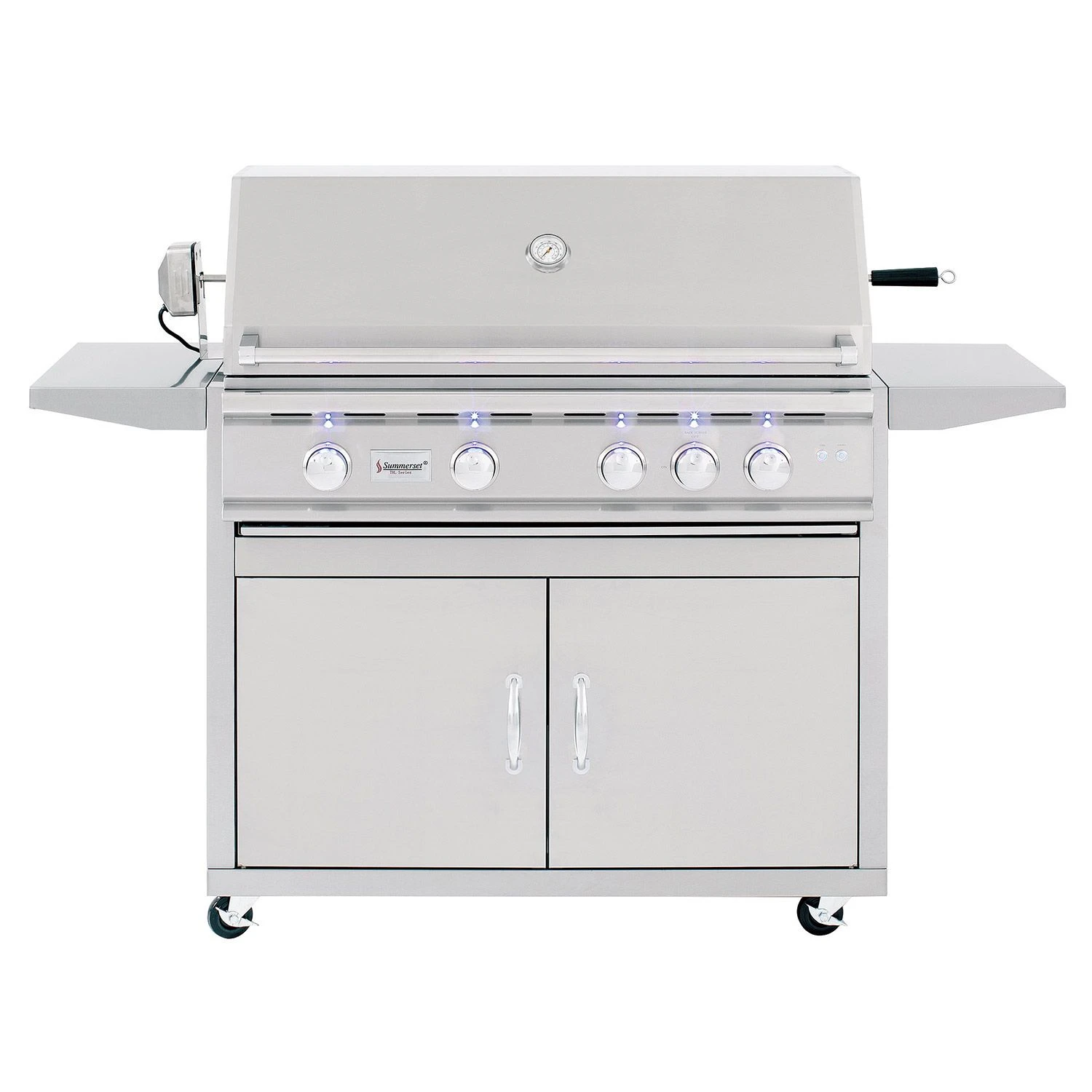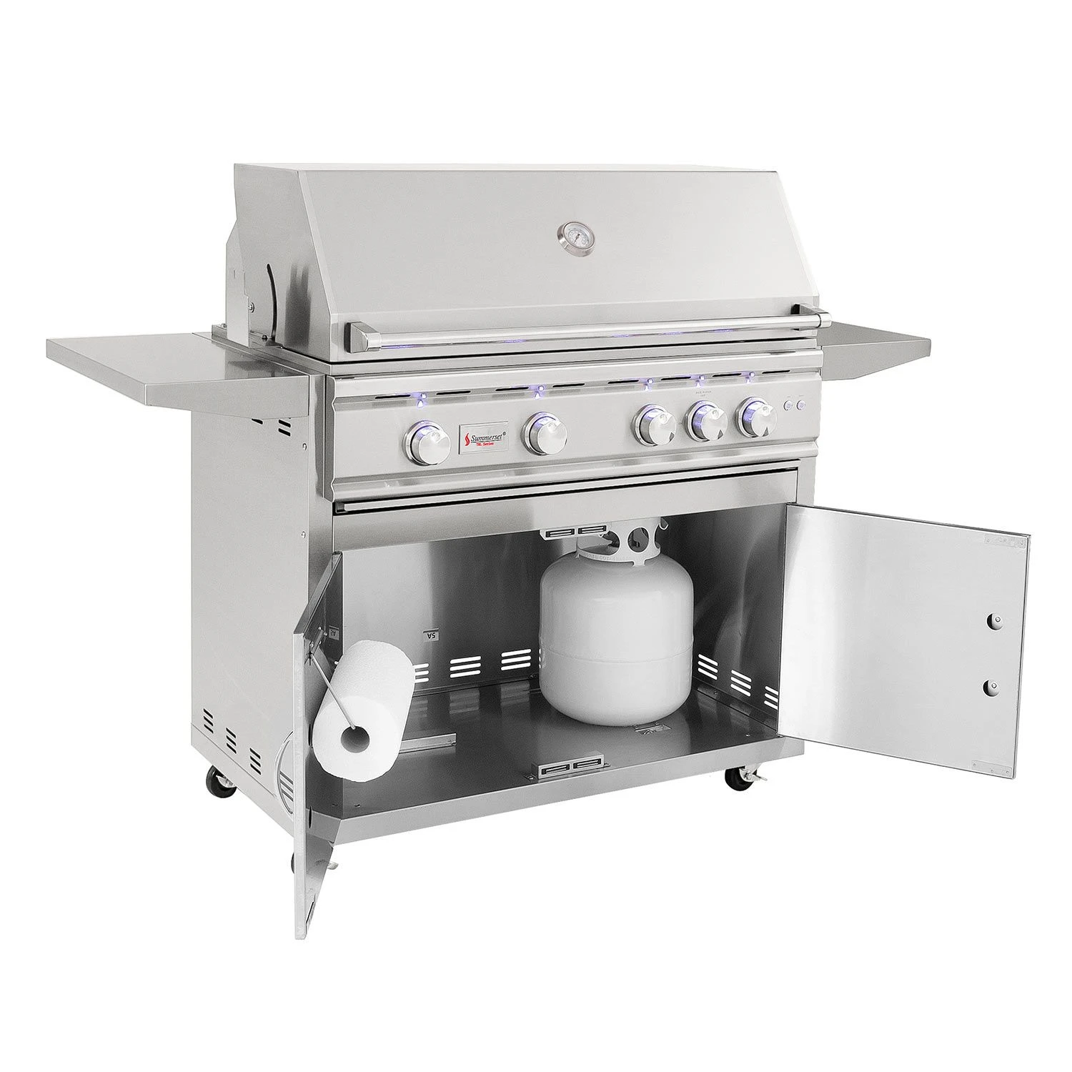 Summerset TRL38 TRL Series Gas Grill On Cart, 38-Inch combines superior quality and high performance to provide a terrific option to complete your outdoor kitchen. The grill features a solid 304 stainless steel construction to ensure durability and longevity while each of the (4) heavy duty U-Tube burners are rated for 18,000 BTU to provide high heat to the unique captured briquette trays. The captured briquette trays provide even radiant heat across the 1076in² cooking surface and eliminate hot and cold zones as the 8mm thick stainless steel grates offer a thick gauge grilling surface for professional style grill marks.