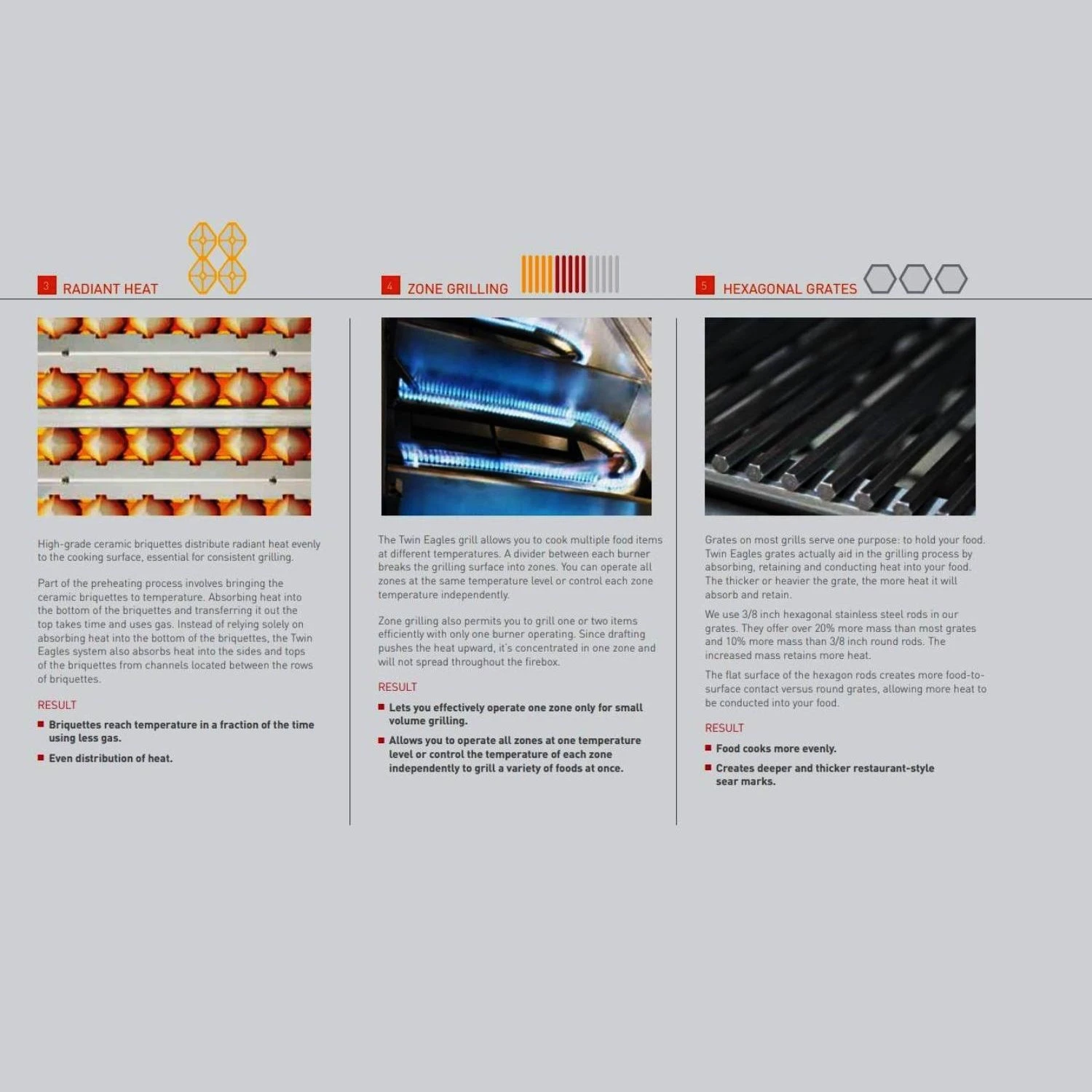 Each Twin Eagles grill combines direct heat from specifically placed ports and channels with radiant heat from the ceramic briquette grates, allowing your grill to reach higher temperatures and distribute heat evenly–ridding your grill of hot and cold spots. Also unique to Twin Eagles are their 3/8-inch stainless steel hexagonal grates. These heavy-duty grates allow more heat retention and surface area, resulting in deep, dark, restaurant-style sear marks.