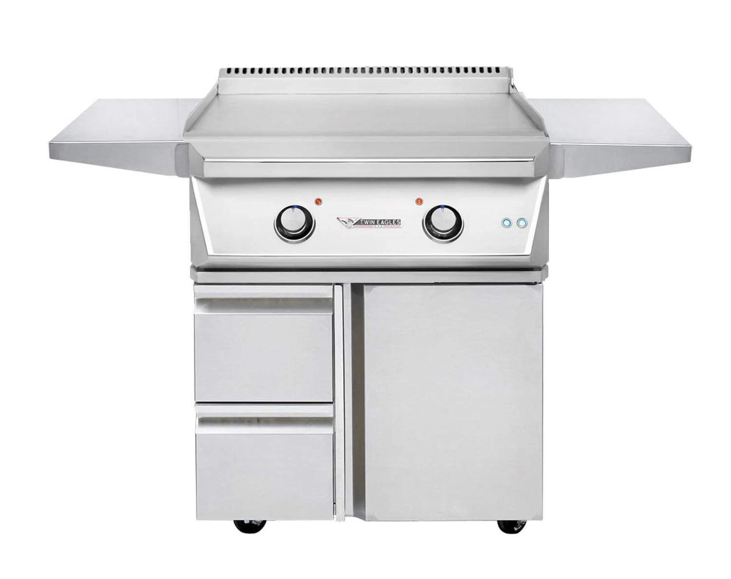 Twin Eagles TETG30-C Teppanyaki Griddle On Cart With Drawers And Door provides one of the most unique outdoor cooking applications with high-end performance in mind. The two independently controlled gas burners combine for 40,000 BTUs to heat the 5/16-inch thick stainless steel griddle surface. The Teppanyaki Griddle is a great addition to any outdoor kitchen, and allows more cooking applications when complimented with your grill. The 750-square-inch griddle surface turns your outdoor kitchen into a huge breakfast station for eggs, pancakes and bacon, works great for Japanese Hibachi style stir-fry, and everything in between–use this griddle any time! A matching cart with drawers and a door offers an added level of convenience with additional storage or space for a propane tank.